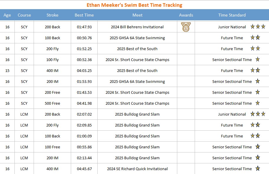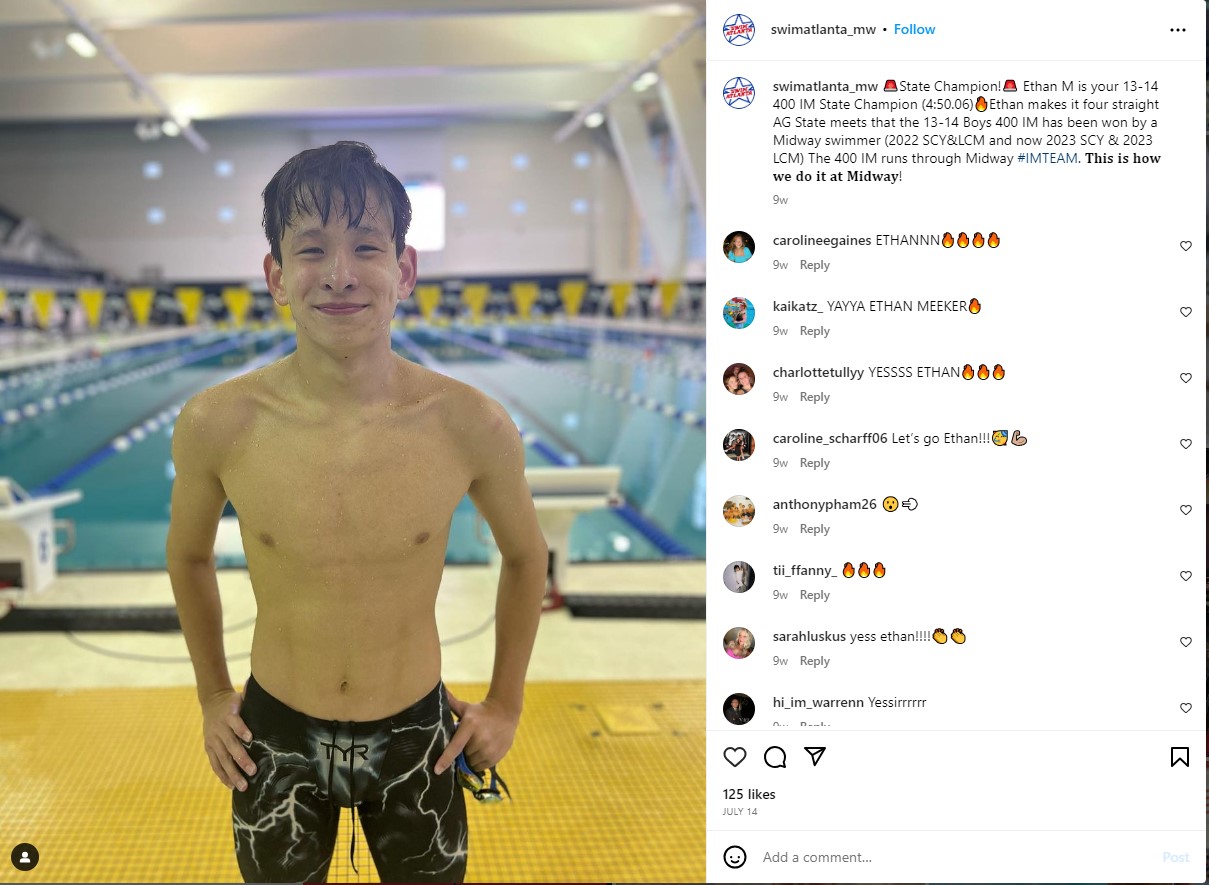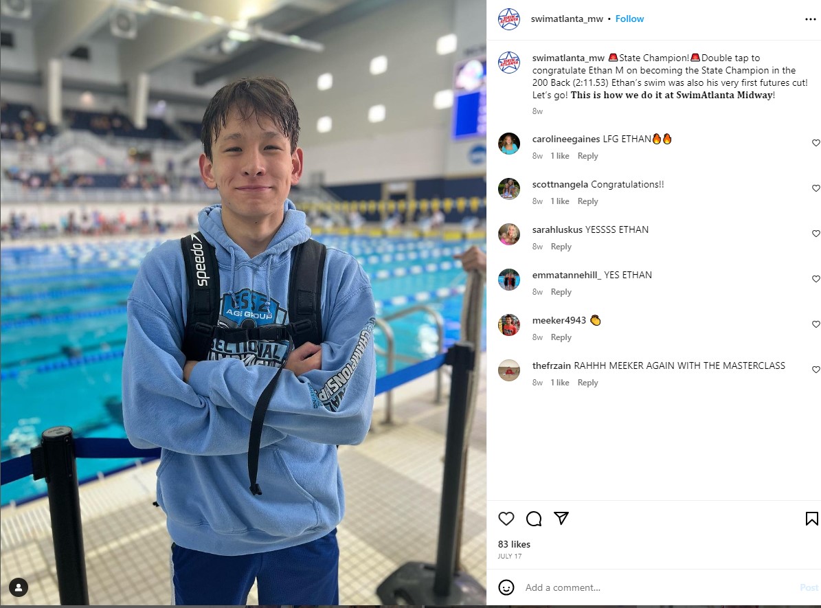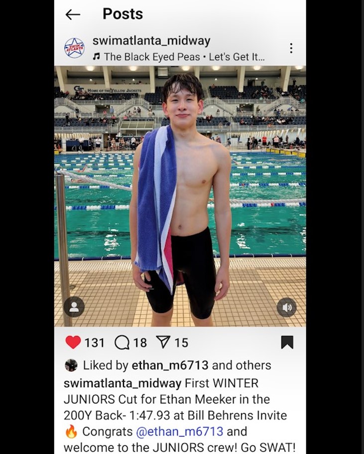 Hello, I’m Ethan Meeker, a sophomore at South Forsyth High School in Georgia. Swimming has been a lifelong passion of mine, and I’ve been a dedicated member of the Swim Atlanta team since I was 10 years old. At age 16, I achieved a significant milestone by qualifying for the 2024 Speedo Winter Junior Championships in the 200 backstroke—my strongest event. Over the years, I’ve also competed at state championships and other national meets. As a freshman, I set the South Forsyth school record in the 200 Individual Medley and was honored as Forsyth County's 'Swimmer of the Year' in 2023.